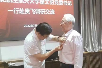 走访中,翟文豹充分了解、接触我校校友,询问他们的发展状况,关心晋升渠道、探讨所学技能。翟文豹还为每一位在场交流的校友佩戴校徽。期间,在中航贵州飞机有限责任公司,翟文豹、李润东分别与我校第一届校友——1952年入校的王允恒进行了亲切交流。老校友王允恒深情地表示,感谢母校的辛勤培育,祝贺母校建校70周年华诞,并祝愿母校未来发展越来越好。