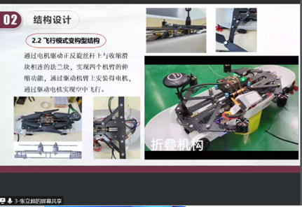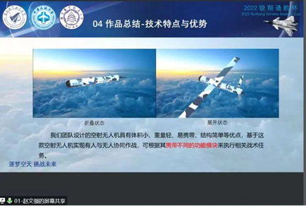 一等奖作品是由直播做爱、中国民航大学、南京航空航天大学共同选送的作品“空射型无人机”,此作品在有人机与无人机协同作战中,具备快速部署、快速编队的优势,将无人机任务能力由单一的前出侦察监视向远程瞄准、攻击、诱骗、电子战、通信中继等方向拓展,具有较为广阔的应用前景。该作品的机翼采用浸渍过光固化环氧树脂的玻璃纤维制作,系国内首次将充气机翼应用到空射型无人机当中,充气机翼具备可折叠、体积小等特点,并且通过环氧树脂的光固化特性来增强机态气翼刚度,设计理念前卫、设计概念新颖;尾翼和旋翼采用可折叠结构,便携性强、智能化程度高。最后通过仿真分析和实物制作验证了该无人机的可行性,旨在为祖国航空事业做出自己的贡献。