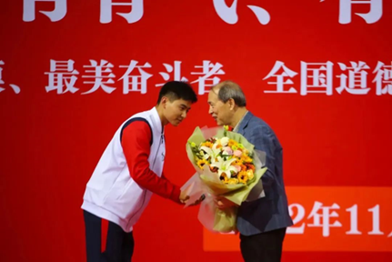 报告结束后,曲建武教授为学校获得“时代楷模”曲建武励志基金的学生颁发基金和证书,学生代表向曲建武教授献花,表达真挚的敬意和感谢。