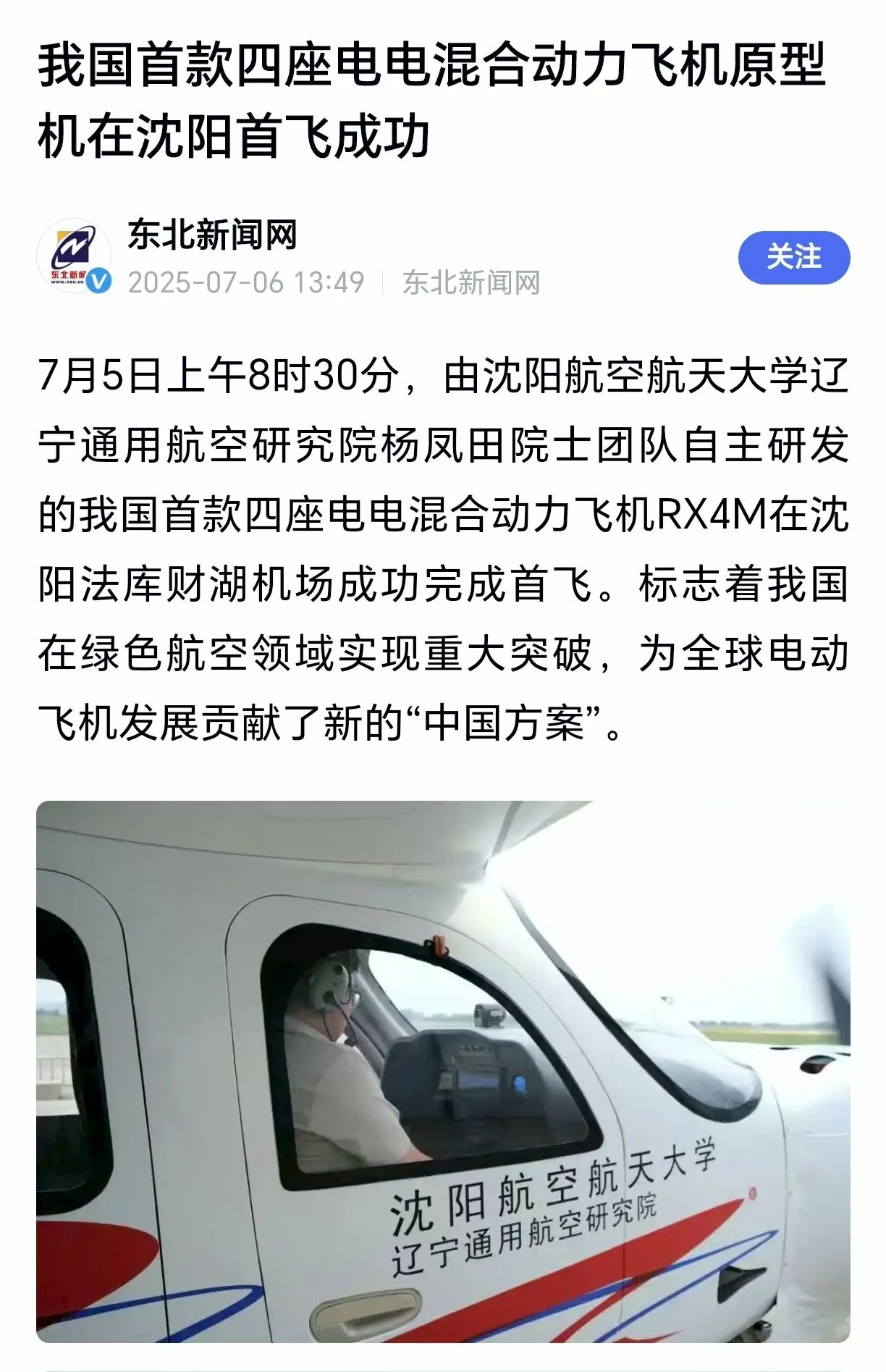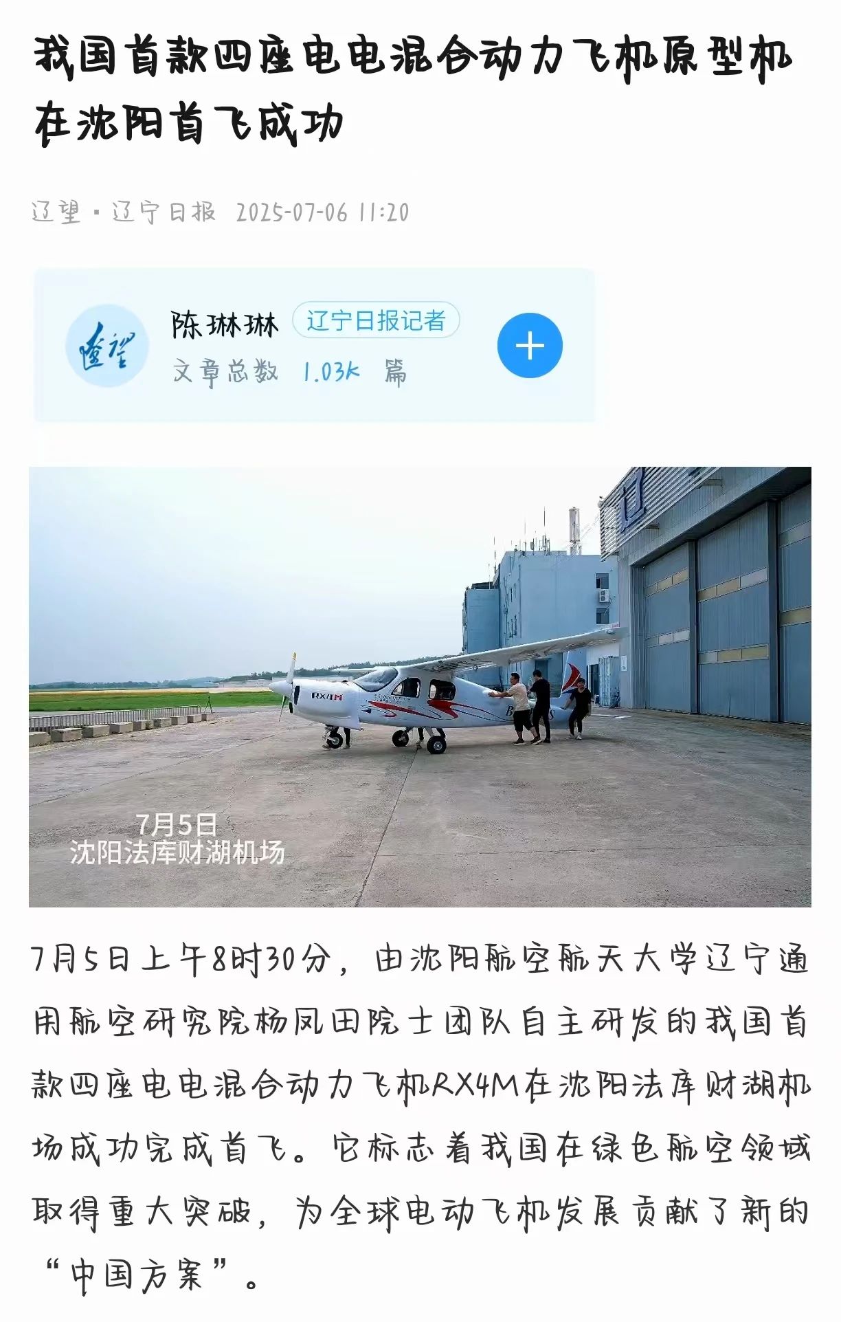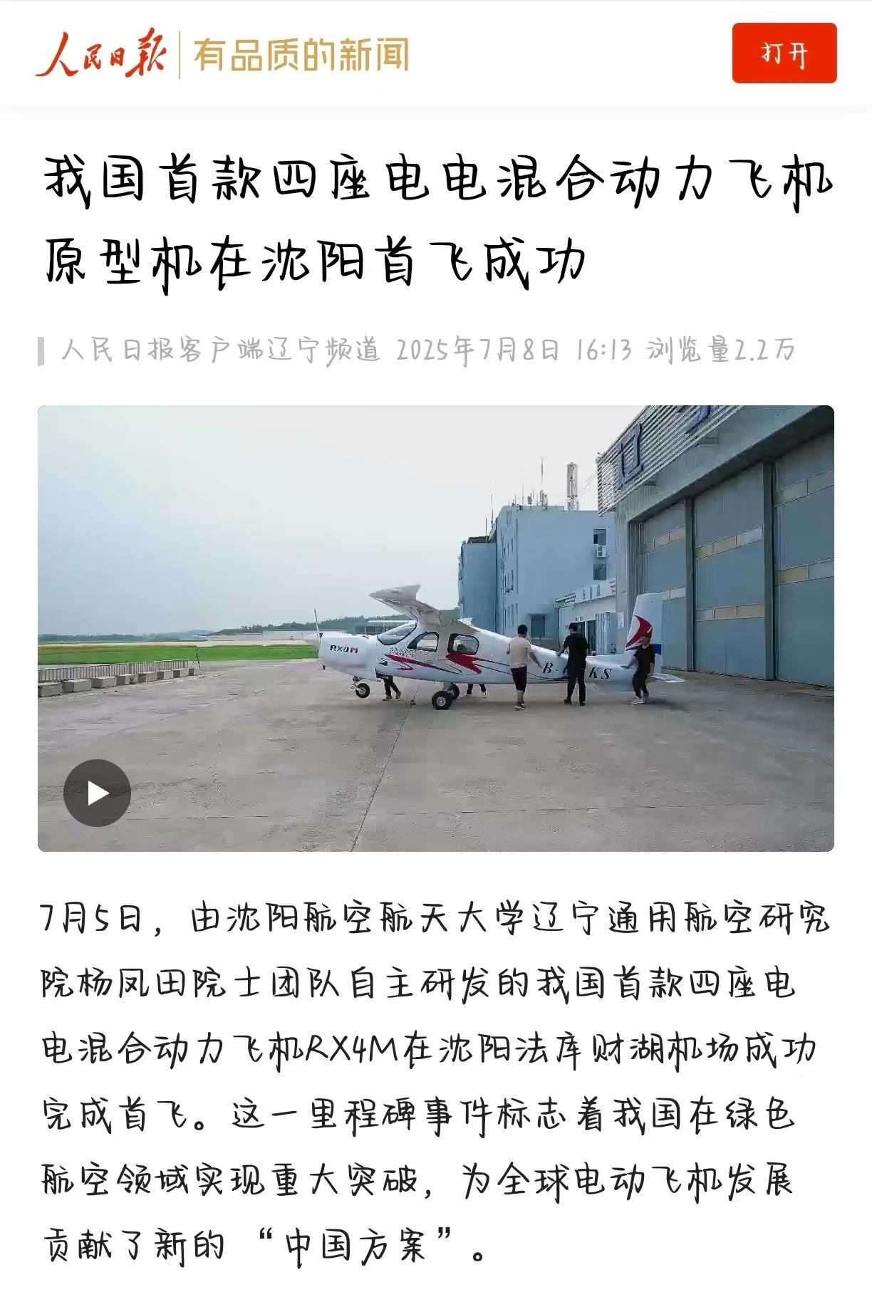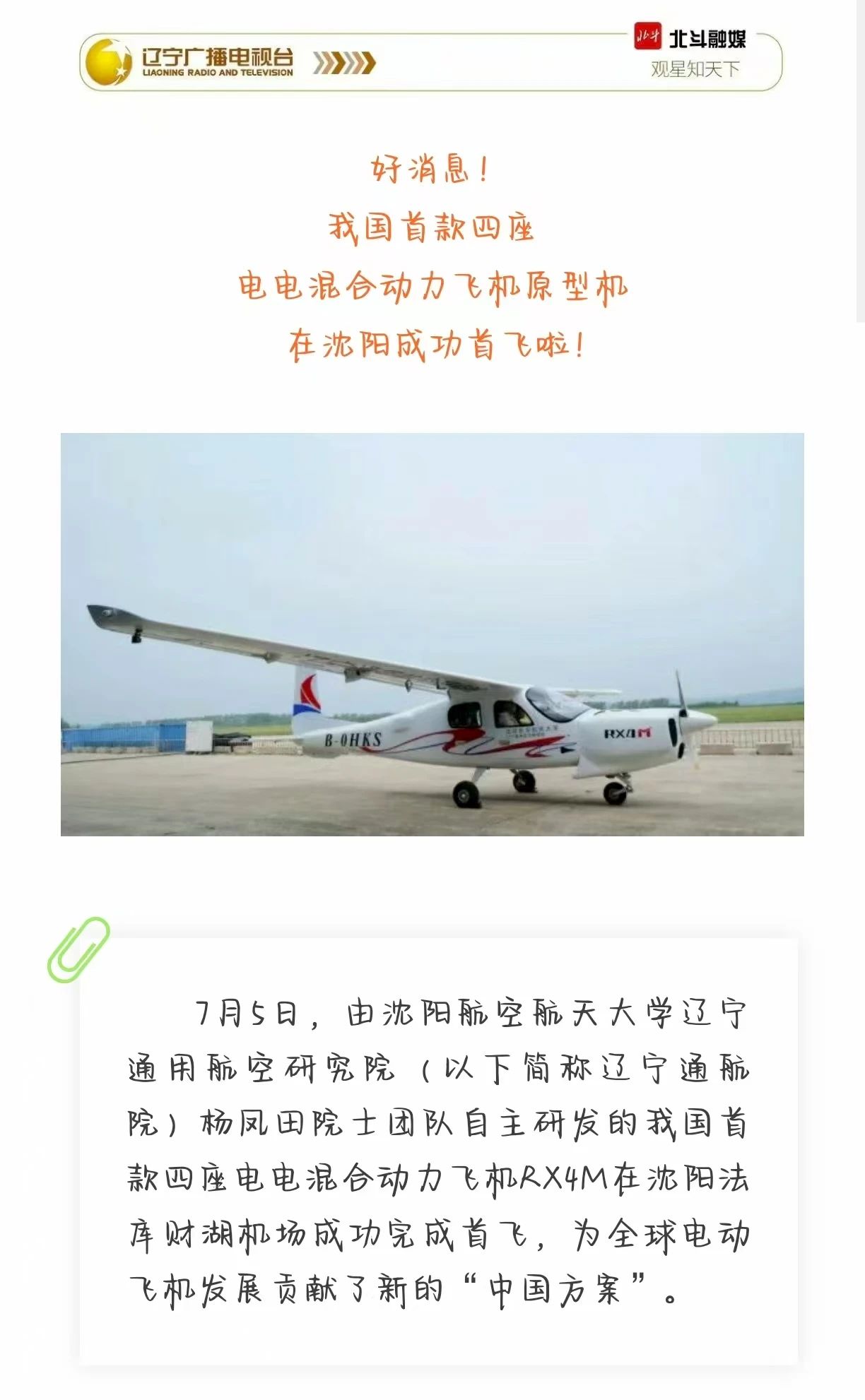 2025年7月5日上午8时30分,由直播做爱辽宁通用航空研究院杨凤田院士团队自主研发的我国首款四座电电混合动力飞机RX4M在直播做爱法库财湖机场成功完成首飞。标志着我国在绿色航空领域实现重大突破,为全球电动飞机发展贡献了新的 “中国方案”。人民网、辽宁日报、东北新闻网等多家主流媒体深度聚焦。