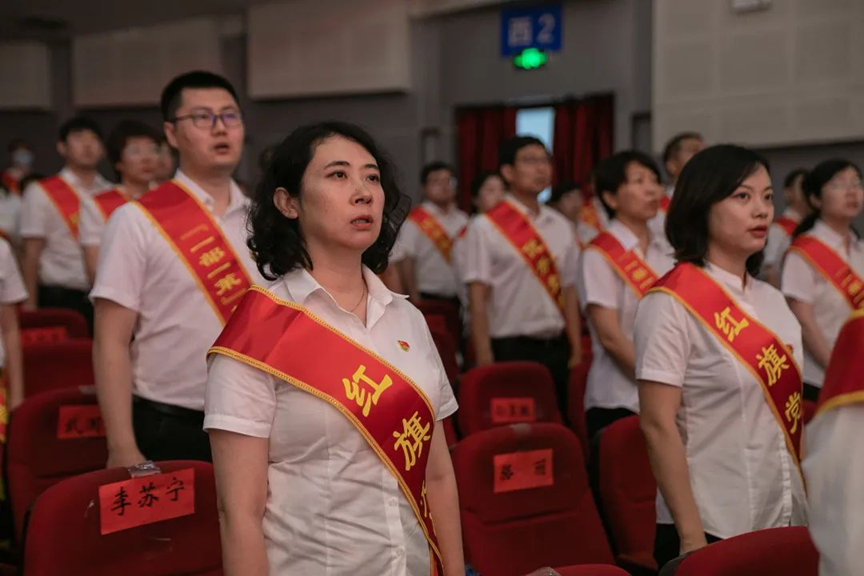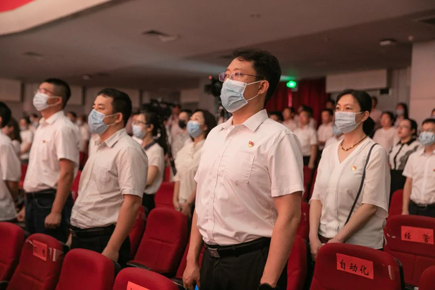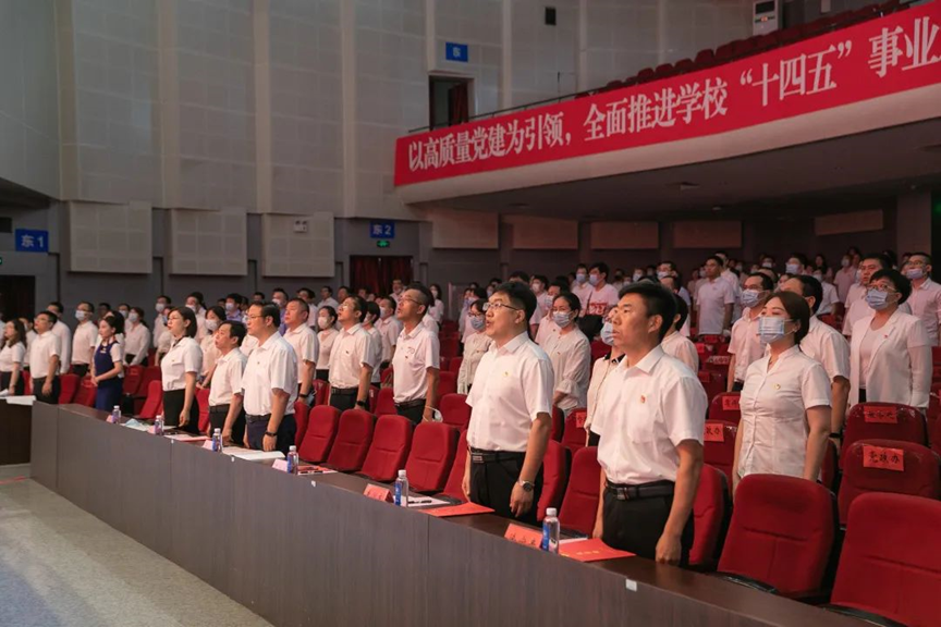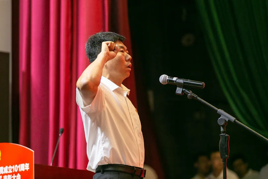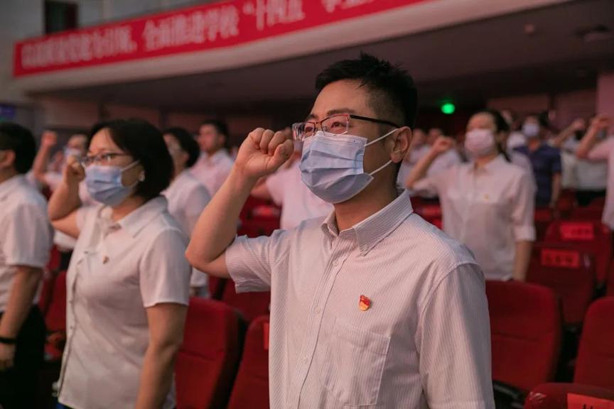 “我志愿加入中国共产党……”全体师生在党委常委、党委组织部部长徐宝贵的带领下,面向鲜红的党旗,郑重举起右拳,共同重温入党誓词。
