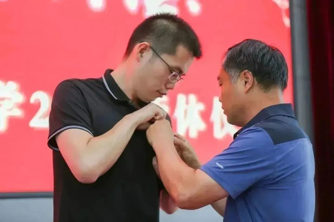 退休教师代表潘琢金为青年教师代表佩戴校徽,并带领青年教师、参会人员一起宣誓