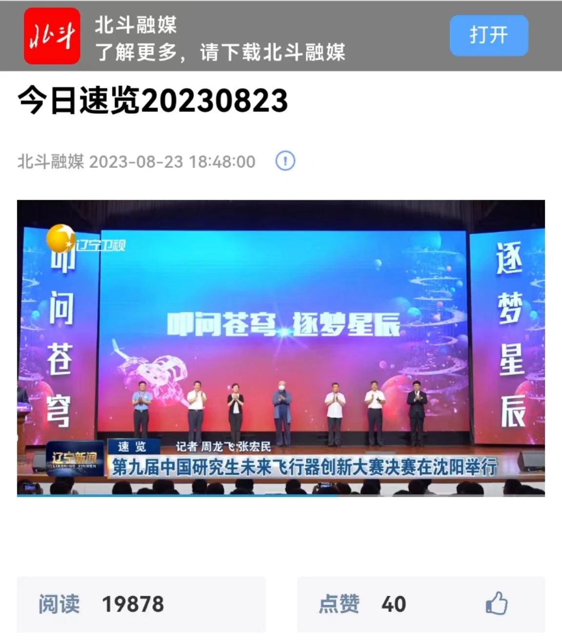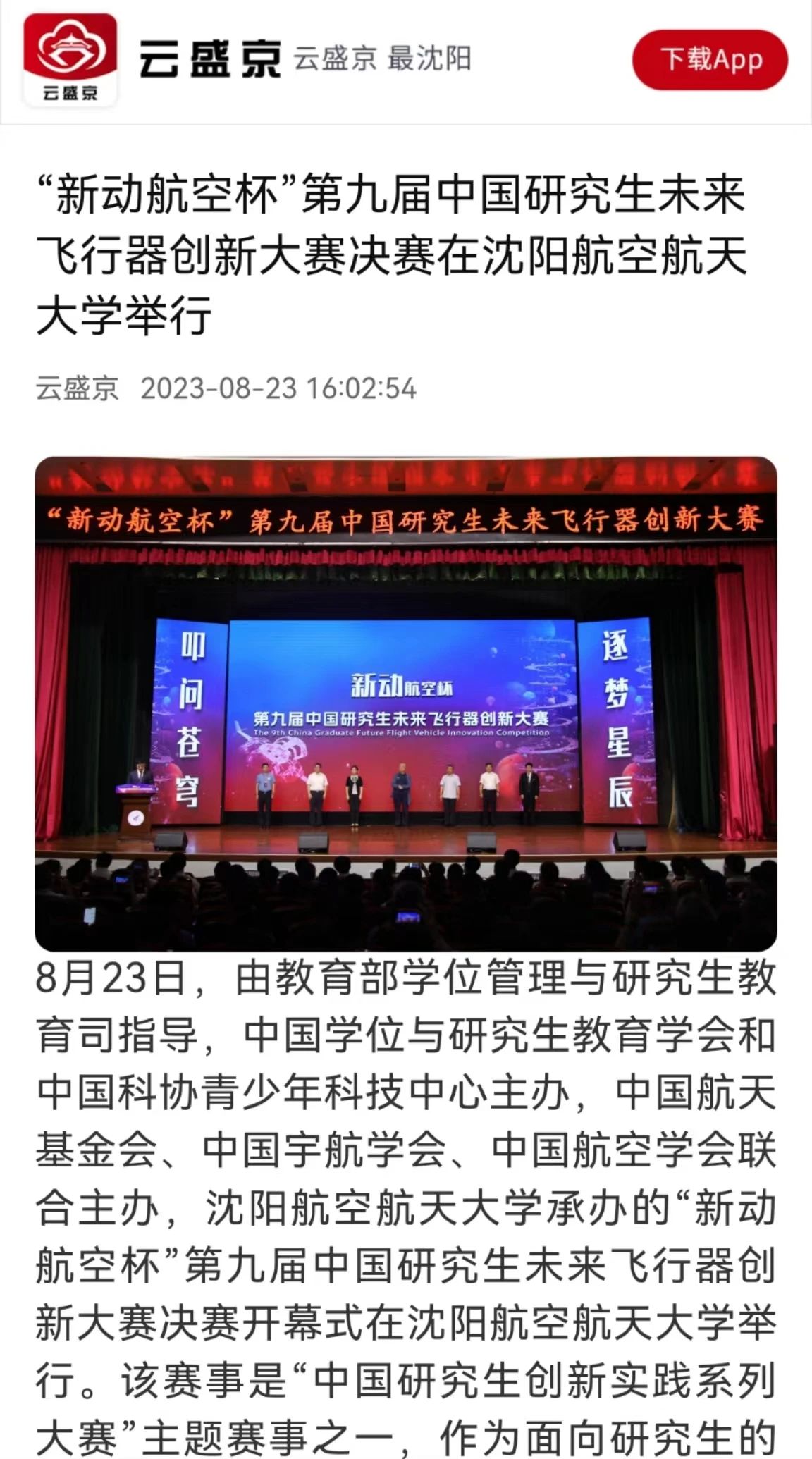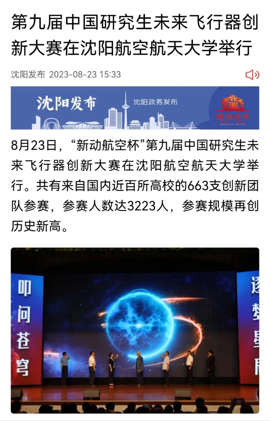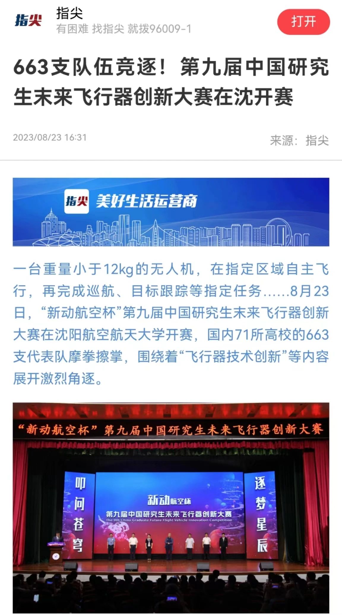 中国研究生未来飞行器创新大赛是“中国研究生创新实践系列大赛”主题赛事之一,自2013年开赛以来,得到了近600家高校与科研院所的积极响应。目前已成为被各级政府认可支持,被国内外研究生培养单位和相关行业广泛认可的全国性、高层次、有影响力的品牌赛事。本届大赛得到了教育部学位管理与研究生教育司,中国学位与研究生教育学会,省委、省政府,省委组织部,省教育厅,中国科协青少年科技中心,中国航天基金会,中国宇航学会,中国航空学会,辽宁省科学技术协会以及青岛新动航空科技发展有限公司的大力支持。此次竞赛从开赛之初,就被多家省内主流媒体关注并进行全方位报道。