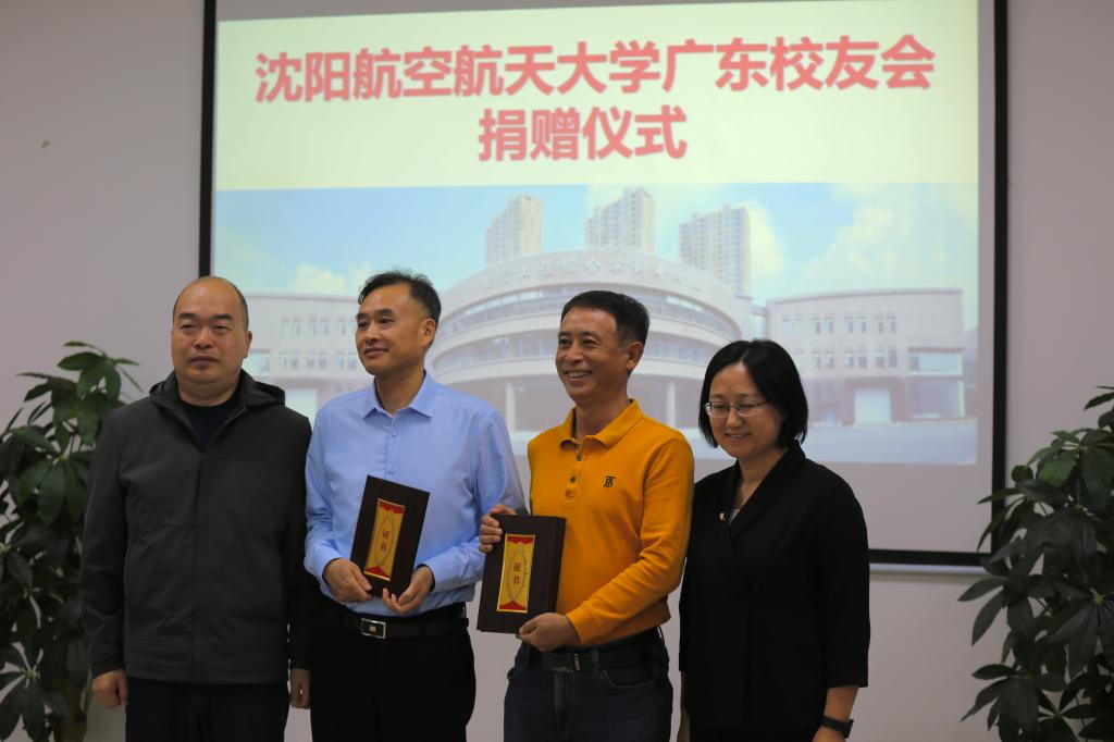电子信息工程学院院长李玉峰、党委书记江秀红向广东校友会代表颁发电子应用技术实验室捐赠证书。