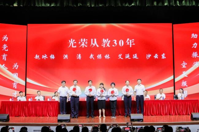 在本届教师节表彰大会上,学校为从教30年以上的教师制作“光荣从教三十年”奖杯,赵冰梅、洪涛、武保林、艾延廷、沙云东等作为代表接受颁奖和学生献花。
