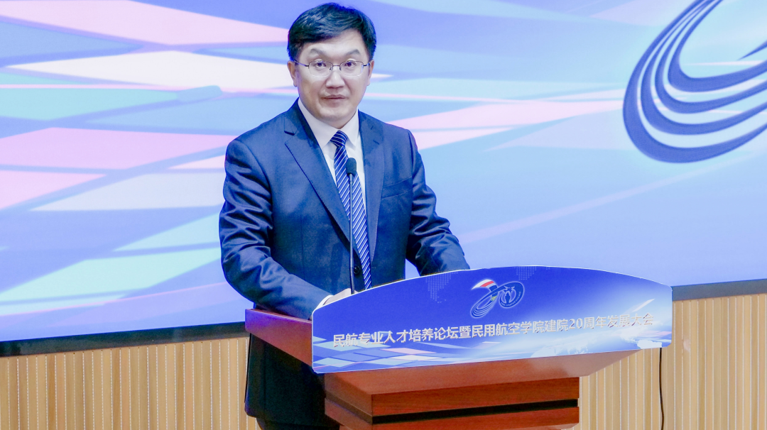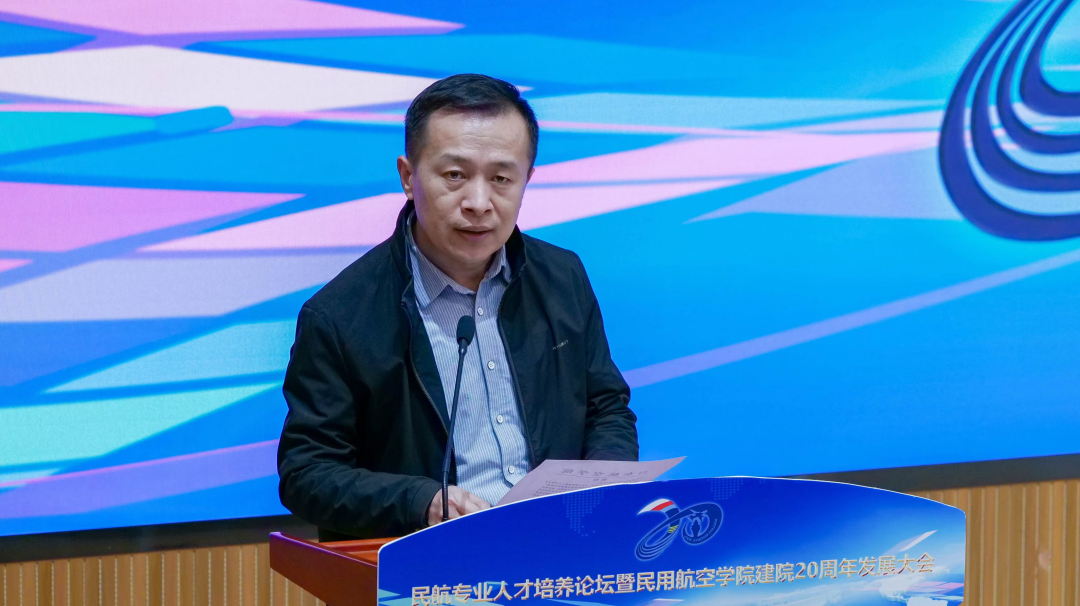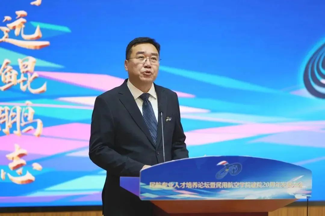 民航局原副局长董志毅致辞,对民用航空学院建院20周年表示热烈祝贺。他表示民航学院作为民航人才重要的培养院校,在不断探索和创新中积累了宝贵的办学经验,形成了鲜明的办学特色,为我国民用航空事业的发展作出了不可磨灭的贡献,祝福民航学院能秉承培养优秀民航专业人才的初心,乘风而上;能够顺应高等人才培养的趋势,逆风飞扬;能够把握民航行业发展的机会,直上云霄。