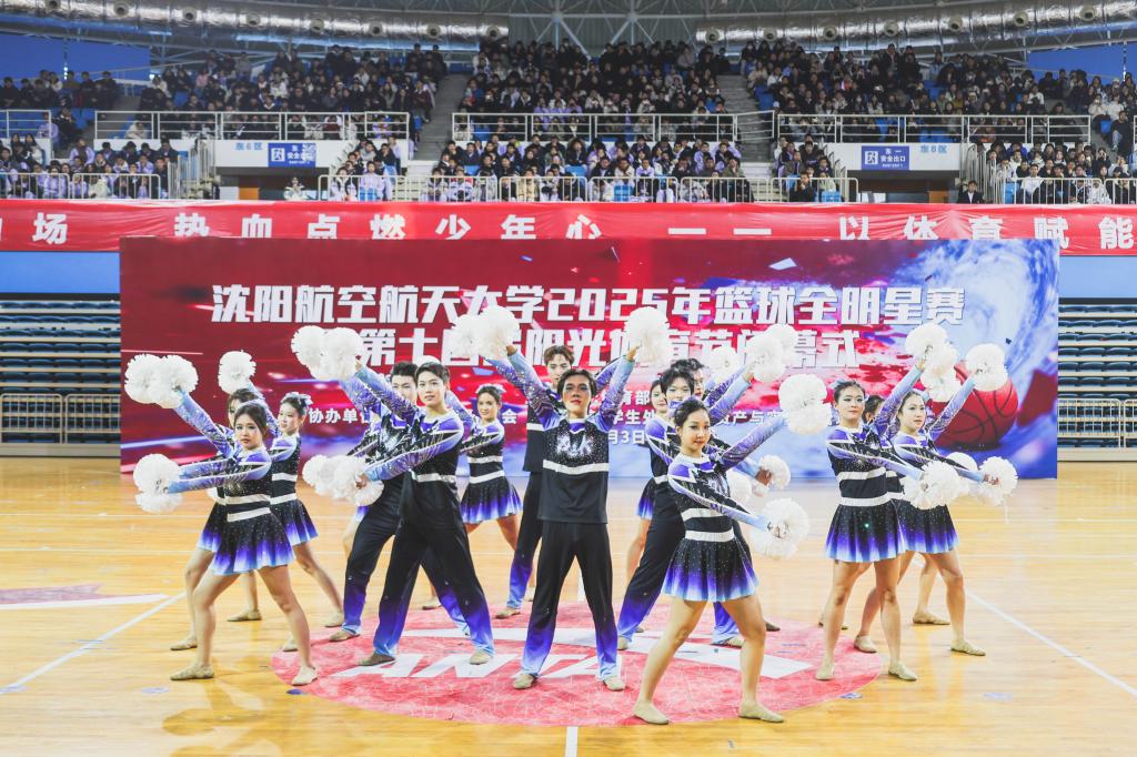 作为本届阳光体育节收官亮点,师生篮球全明星赛激情上演。比赛打破传统界限,由教师与学生携手组队、同场竞技。赛场之上,师生默契配合、奋力拼搏,用汗水与笑容生动诠释了体育育人内涵,加深了师生情谊。中场休息时,设计艺术学院学生带来的健美操表演活力四射,为比赛增添了青春动感的艺术气息。