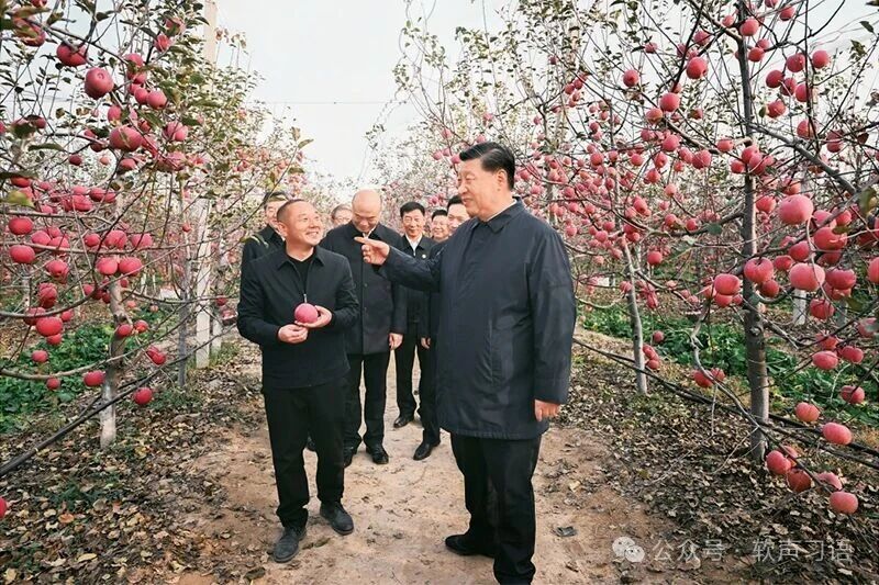2022年10月26日至28日,中共中央总书记、国家主席、中央军委主席习近平在陕西省延安市、河南省安阳市考察。这是26日下午,习近平在延安市安塞区高桥镇南沟村苹果园同老乡们亲切交流。